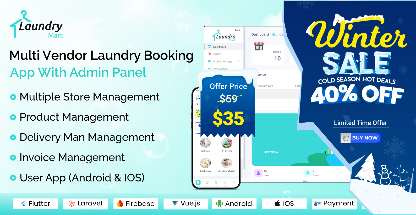 LaundryMart is an online platform that allows you to run your business with multiple vendors and products in one place. It is built with Laravel and Flutter Framework, which provide a flexible solution for your business needs.