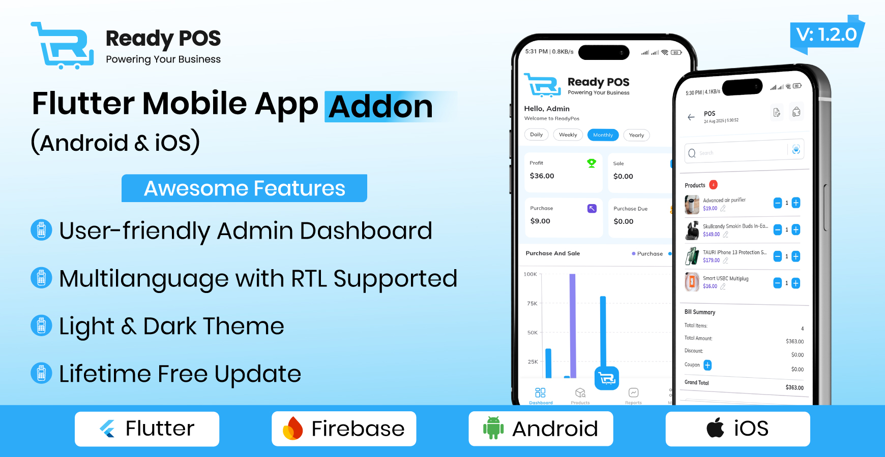 ReadyPOS is a mobile point-of-sale (POS) app that works with Android and iOS devices. It is built with Flutter, a fast and powerful framework for creating beautiful cross-platform apps