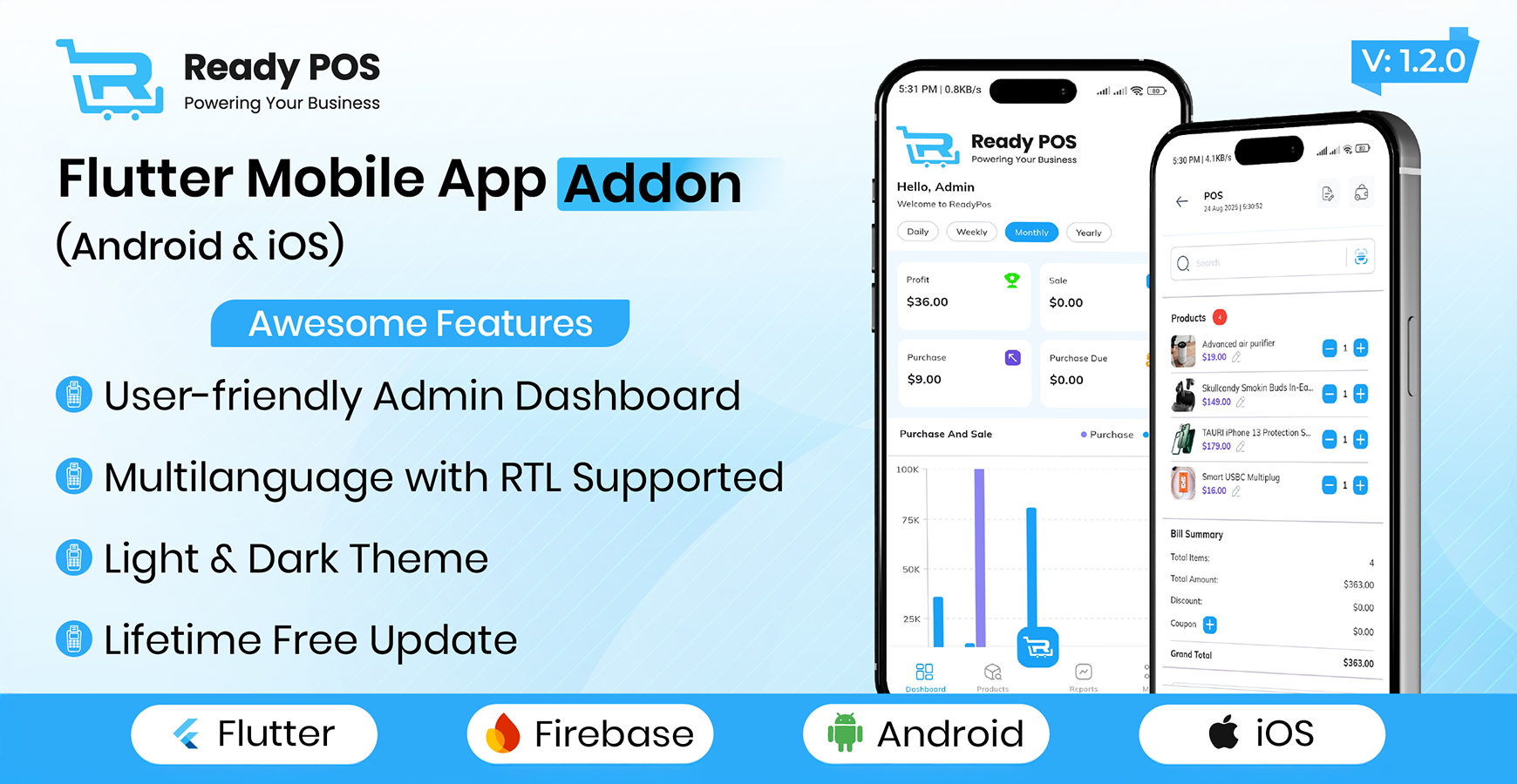 ReadyPOS is a mobile point-of-sale (POS) app that works with Android and iOS devices. It is built with Flutter, a fast and powerful framework for creating beautiful cross-platform apps